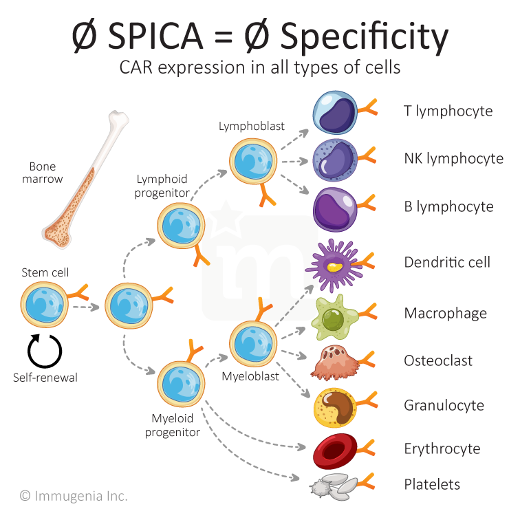 A promoter is a sequence that turns a gene on/off. Those promoters dictate which proteins are expressed in a given cell, allowing for a cell to be specialized in its function. When a cell is genetically modified with a CAR or another added gene, the new gene is expressed in all types of cells because the used promoter is not tailored to be selective. This precludes the use of stem cells for immunotherapy. Immugenia has solved this technological roadblock and unlocked the power of stem cells.